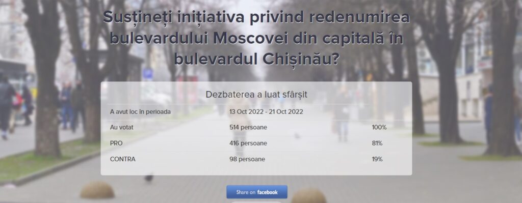 Pe platforma Debates.md a fost organizată o dezbatere la acest subiect, care s-a desfășurat în perioada 13-21 octombrie 2022. La dezbatere au participat 514 persoane, dintre care doar 19% au fost contra, iar 81% susțin redenumirea bulevardului Moscovei din capitală cu cea a bulevardului Chișinău sau orice altă denumire.