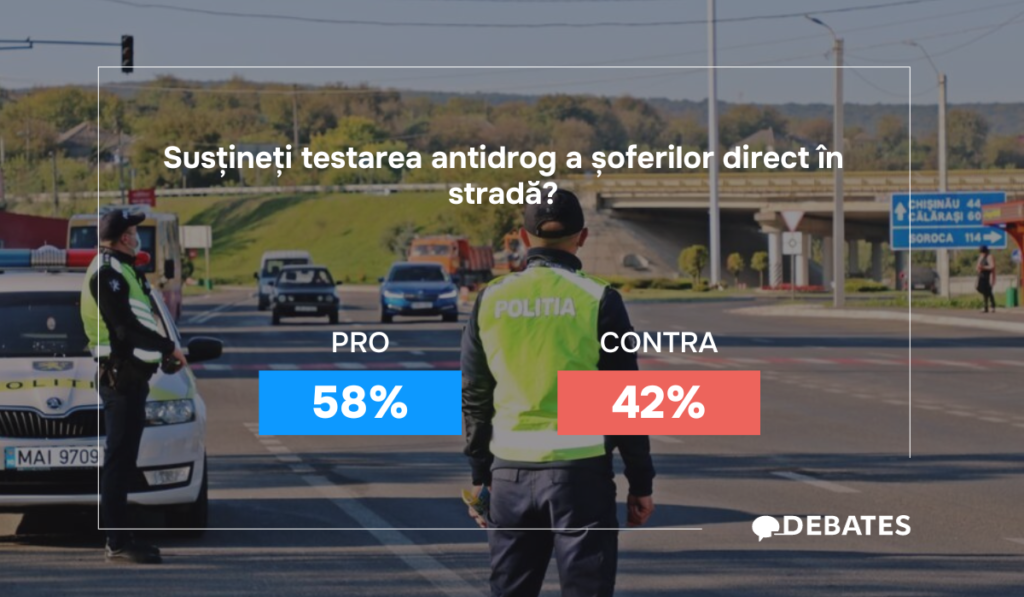 Păreri împărțite despre decizia deputaților de a permite testarea șoferilor pentru consumul de droguri chiar în stradă. Asta reiese din rezultatele dezbaterii organizate de echipa debates.md. La întrebarea “Susțineți testarea antidrog a șoferilor direct în stradă? ”, 58.47% dintre respondenți au răspuns Pro, iar 41.52% au spus că sunt Contra. La acest subiect, pe site-ul debates.md au votat 419 persoane.