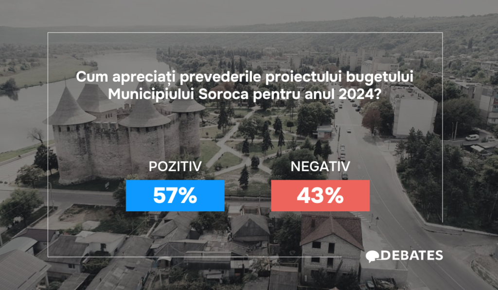 Echipa Debates.md a realizat o analiză a proiectului bugetului Municipiului Soroca pentru anul 2024 și a invitat sorocenii să-și exprime opinia despre modul în care autoritățile locale au repartizat cheltuielile pentru acest an. Astfel, peste 57% au apreciat Pozitiv prevederile bugetului Municipiului Soroca pentru anul 2024. În același timp, 42,79% dintre participanții la dezbatere au o părere Negativă despre modul în care vor fi cheltuiți banii. La dezbatere au participat 229 de persoane.