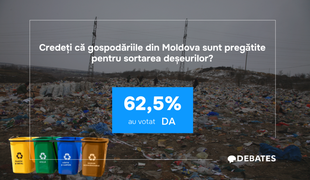 Autoritățile din Moldova vor să instituie, până în 2025, un sistem de colectare separată a deșeurilor, cel puțin pentru deșeurile de hârtie, metal, plastic și sticlă. Guvernul a aprobat acest deziderat inclus în proiectul de modificare a Legii privind deșeurile. Întrebați în cadrul dezbaterii oamenii dacă suntem pregătiți pentru sortarea deșeurilor, aproape 63 la sută din participanți au răspuns că da, iar 38 % – nu.