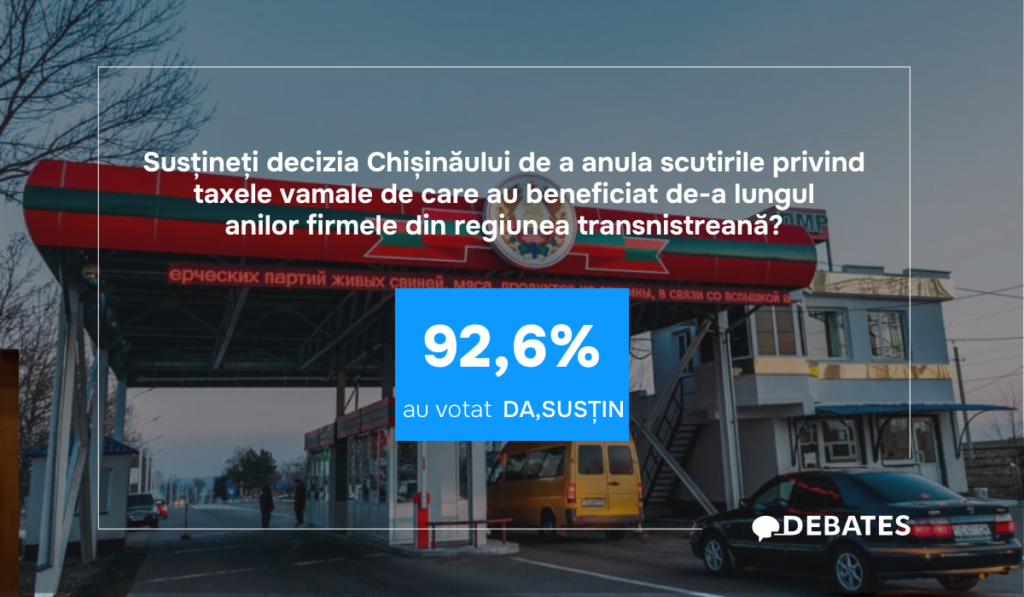 Peste 92% dintre utilizatorii Debates.md susțin decizia Guvernului de la Chișinău de a introduce taxe vamale pentru firmele din regiunea transnistreană. Și doar puțin peste 7% au spus că sunt Contra acestei hotărâri. Sunt rezultatele dezbaterii organizate la acest subiect în cadrul căreia au participat 407 persoane.