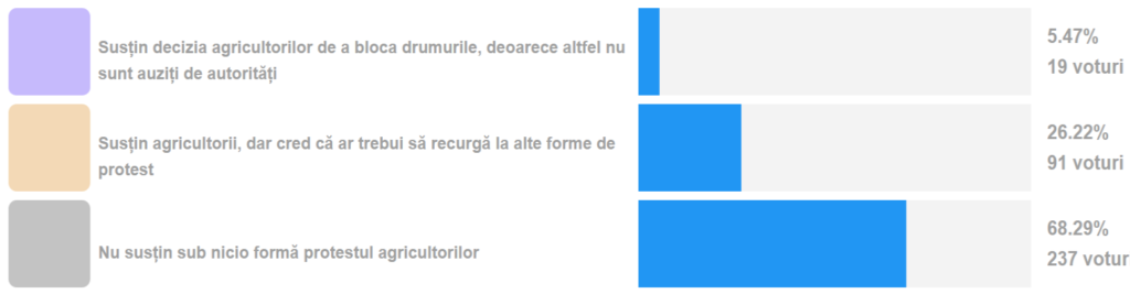 Protestul agricultorilor, prin blocarea unor drumuri importante din țară, inclusiv a celui care duce spre vama Leușeni, se pare că a indignat multă lume. La dezbaterea desfășurată de echipa Debates.md la acest subiect, peste 68% dintre utilizatori au răspuns că nu susțin sub nicio formă protestul fermierilor, iar 26% au spus că susțin agricultorii, dar cred că aceștia ar trebui să recurgă la alte forme de protest. În același timp, doar aproape 6% dintre participanții la dezbatere au spus că susțin decizia agricultorilor de a bloca drumurile, întrucât altfel nu sunt auziți de autorități. La dezbatere au participat 347 de persoane.
