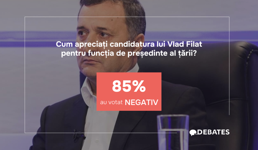 Decizia fostului premier Vlad Filat de a candida la funcția de președinte al țării în cadrul alegerilor prezidențiale care se vor desfășura în această toamnă se pare că nu este privită cu ochi buni de către societate. Întrebați cum apreciază candidatura lui Vlad Filat pentru funcția de președinte al țării, aproape 85% dintre utilizatorii Debates.md au spus că “Negativ” și doar puțin peste 15% au răspuns cu “Pozitiv”.
