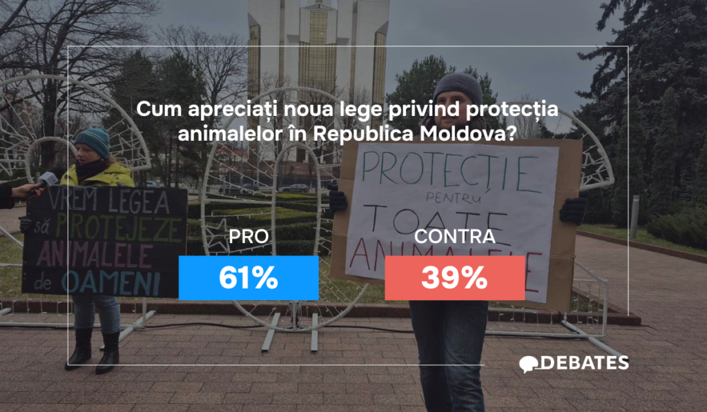 Majoritatea utilizatorilor Debates.md salută adoptarea unei legi care să protejeze animalele. Totuși, unii susțin că documentul în acest sens, votat de deputați în prima lectură, ar trebui îmbunătățit. Aceste concluzii sunt scoase la iveală de rezultatele dezbaterii pe marginea legii privind protecția animalelor, dar și din comentariile lăsate de internauți la acest subiect. Astfel, întrebați cum apreciază legea privind protecția animalelor, 61% dintre respondenți au răspuns cu opțiunea PRO, iar 39% s-au arătat nemulțumiți de prevederile documentului. La dezbatere au participat 477 de persoane. În același timp, postarea de pe social media la acest subiect a adunat aproape 100 de comentarii. Iată câteva dintre acestea: