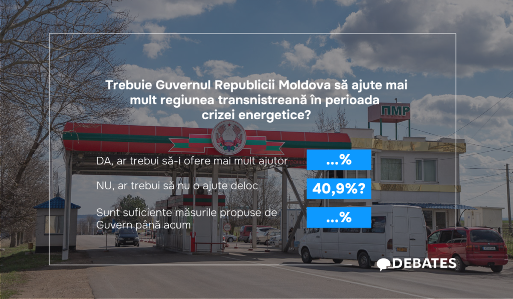 Se pare că cetățenii din dreapta Nistrului sunt foarte supărați pe locanicii din regiunea transnistreană, în special, pe așa numitele autorități de la Tiraspol. Întrebați în cadrul unei dezbateri dacă Guvernul de la Chișinău trebuie să ajute mai mult regiunea transnistreană în perioada crizei energetice, aproape 41% au spus că, de fapt, Chișinău nu ar trebui să ajute deloc locanicii din stânga Nistrului, iar aproape 50% au spus că măsurile propuse de Executiv sunt deja suficiente. Doar 9% dintre respondenți cred că, totuși, Chișinăul ar trebui să se implice mai mult în soluționarea crizei energetice din stânga Nistrului. Echipa Debates.md a organizat o dezbatere la acest subiect, în contextul în regiunea transnistreană s-a pomenit într-o criză energetică gravă, după ce concernul rus Gazprom a oprit livrările de gaze pe 1 ianuarie. La dezbatere au participat 508 persoane.