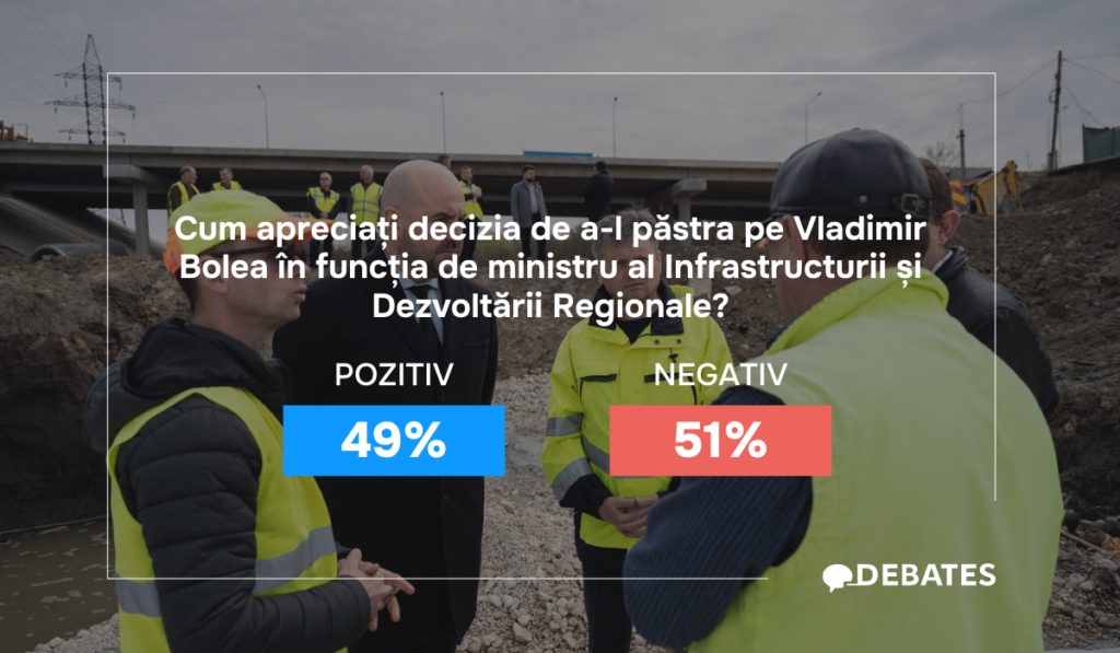 51% cred că Republica Moldova are nevoie de un alt ministru al Infrastructurii. Totuși, 49% dintre respondenți susțin decizia premierului Alexandru Munteanu de a-l păstra pe Vladimir Bolea în funcția de ministru al Infrastructurii și Dezvoltării Regionale. Sunt rezultatele unei dezbateri desfășurate de echipa Debates.md după ce Alexandru Munteanu a anunțat componența Guvernului, unde au fost atât candidaturi noi, dar sunt și câțiva miniștri care rămân în funcție, printre care și șeful de la Infrastructură și Dezvoltare Regională, Vladimir Bolea.